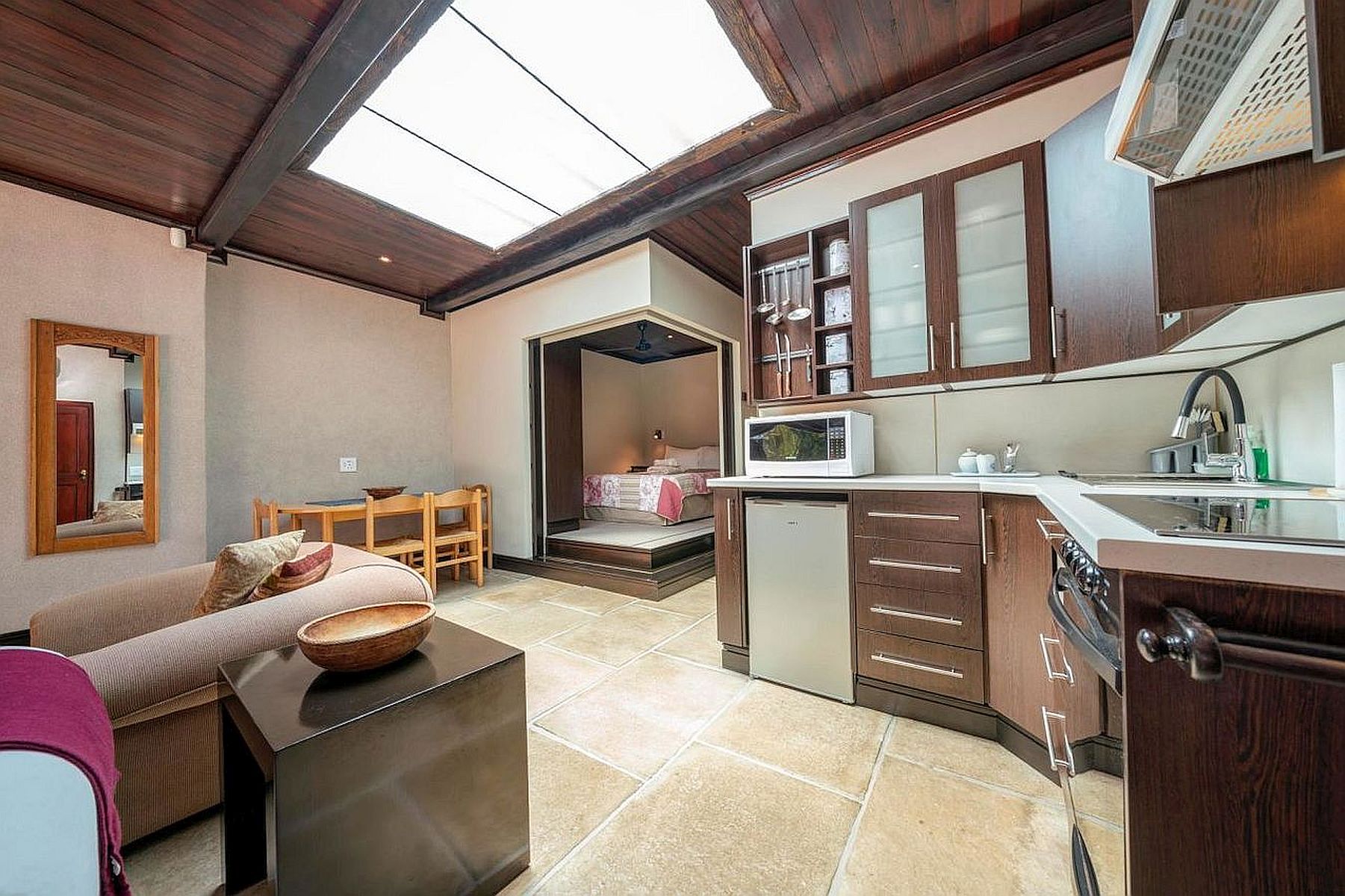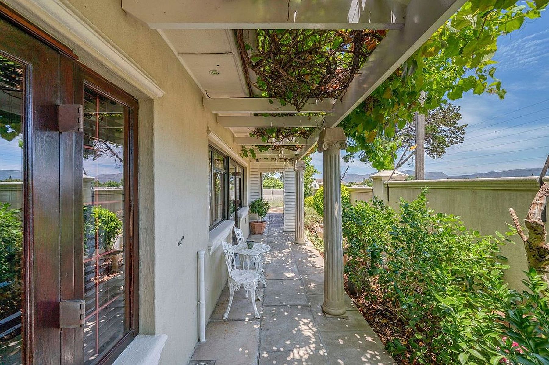 Kaya La Provence is 1.7 km away from the well- known Constantia Village shopping mall and also near to fine dining restaurants, exciting farm stalls, coffee shops, pubs and the Constantiaberg MediClinic. A small shopping centre with a Pick n Pay, PNA stationary, dry cleaners, take away food stalls and dvd/video shop is a five minute walk from Kaya La Provence. The Constantia Wine Route is a stone’s throw away. Easy driving distance to all Peninsula and Atlantic beaches (15-20 km), hiking trails at Tokai Forest, Kirstenbosch Botanical Gardens, Baxter Theatre and the Maynardville Open Air Theatre. The Plumstead train station is a brisk 10 minute walk from Kaya La Provence for easy visiting Cape Town City Centre and also provides a beautiful ride to Muizenberg, Kalkbay and Simons Town.
