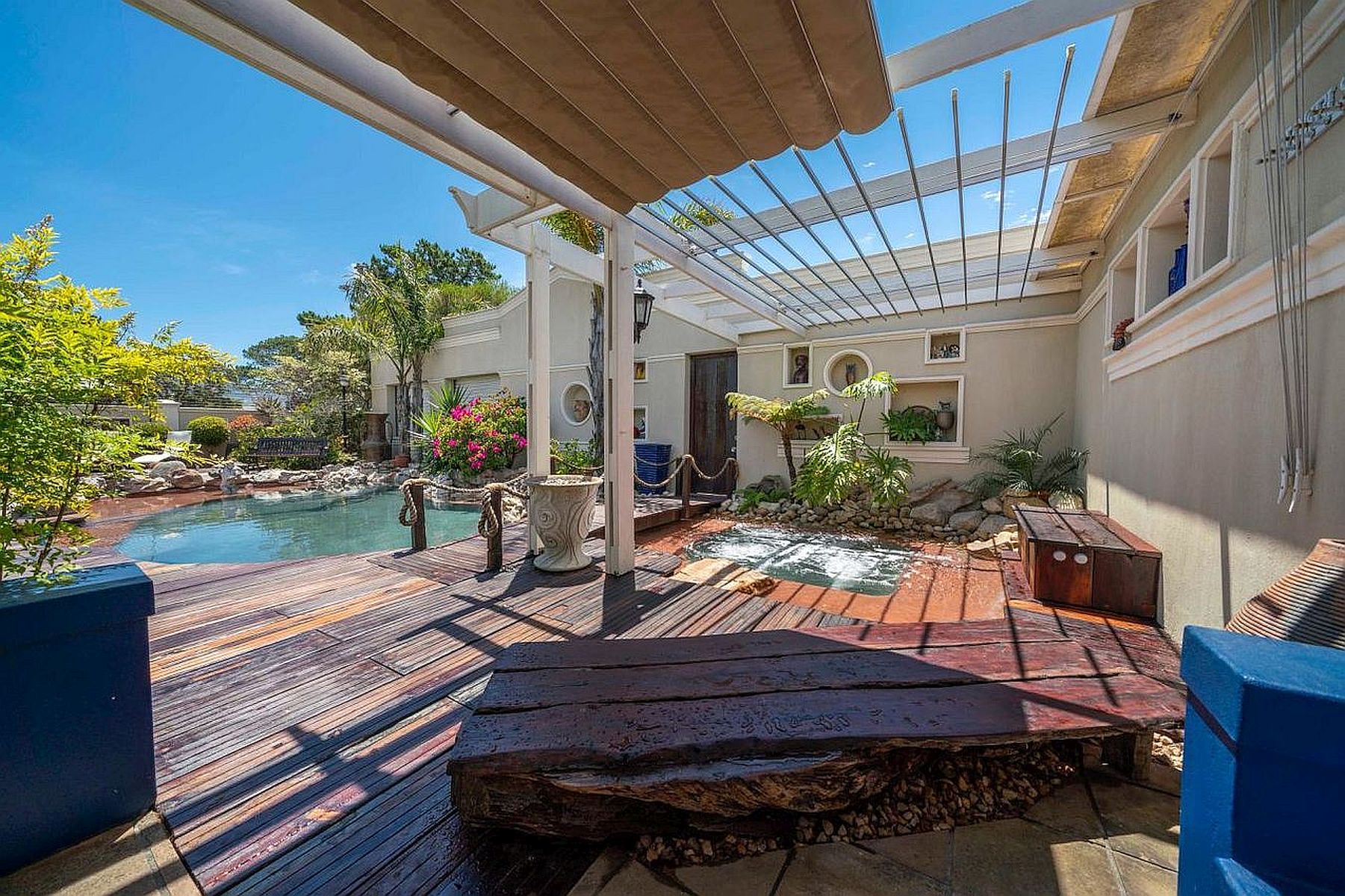 Situated in the Southern Suburbs of Cape Town, in a secure and safe neighbourhood, on the border of Constantia and Plumstead, Kaya La Provence offers a warm and relaxed atmosphere with two B&B Suites in the Manor House and one comfortable and spacious self catering cottage. Experience outdoor living with a communial swimming pool, outdoor Jacuzzi and sun deck nestled in a beautiful tranquil garden.